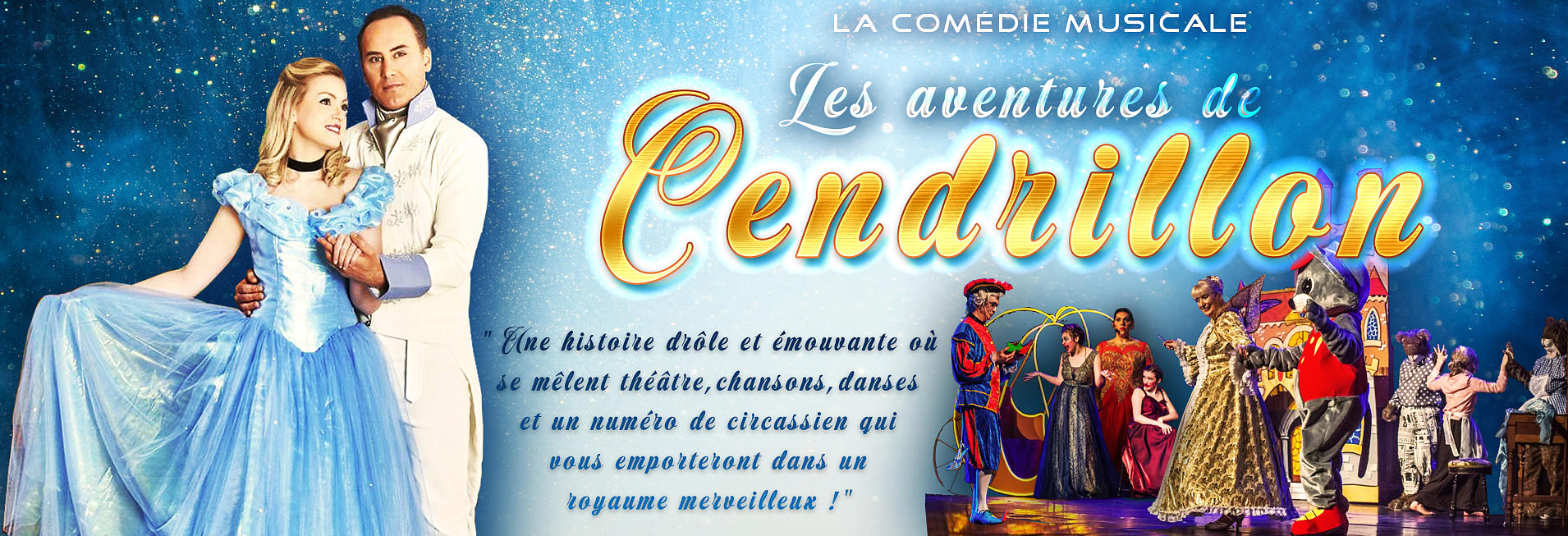 L'histoiredeCendrillonetlasuitedesesaventuresrevuesoùl’humouretla participation des enfants sont prépondérants.Avec en 1 ère partie:Ilétaitunefois,Cendrillon,unejeunefemmeàla beautéparfaitehabitantavecdeuxbelles-soeursnarcissiquesetune méchante belle-mère qui faisaient tout pour l'empêcher d'atteindre son rêve. Maisc'étaitsanscomptersurl’aidedesamarrainelabonneféeetd’une bonne dose de magie ... Cettehistoirevouslaconnaissez:Laféetransformeunecitrouilleen carrosseetlespetitessourisenchevauxpourpermettreàCendrillondese rendre au bal et rencontrer son futur époux.Et en 2ème partie : Mais connaissez vous la suite ? Tous les enfants de 3 à 12ansdu"Royaume"sontinvitésaubalmasquédonnéenl'honneurdu Prince et de la princesse Cendrillon. Maisavantcettefête,lePrinceexpliqueàCendrillonsesdevoirset attributionslorsqu'elleseracouronnéeReineduroyaume.Cendrillon n'imaginaitpasautantd'obligations,sonobjectifétaittoutautre:Créerune école de chant et de cirque pour les enfants. Parviendra- t-elle à convaincre son Prince grâce à l'aide de sa Marraine la Fée et de son fidèle compagnon : la souris "Saperlipopette" ?Le Bal Masqué de Cendrillon :Durée : 00h50 minVersion avec 4 artistes pour 5 personnages sur scène : Le Prince, la princesse, la marraine la fée, une souris et un circassien. Histoire : Voir ci-dessus « 2ème partie des Aventures de Cendrillon ».Le Noël de Cendrillon:Durée : 01hVersion avec 6 personnages sur scène : LePrince,laprincesse,lamarrainelafée,unesouris,1circassienetlePère Noël.